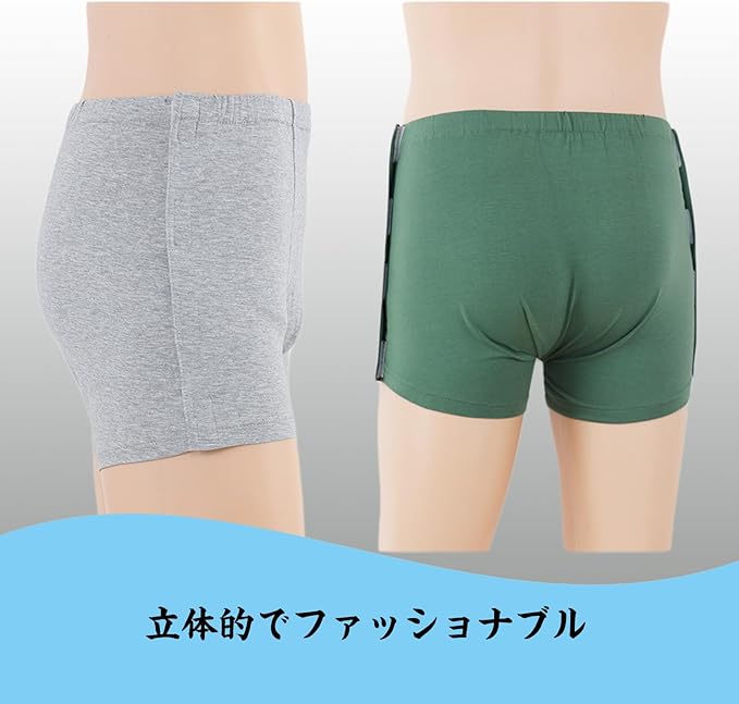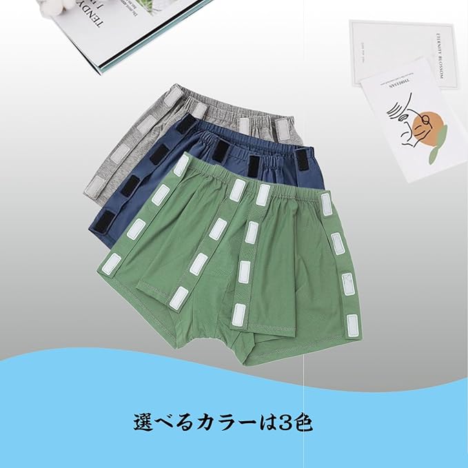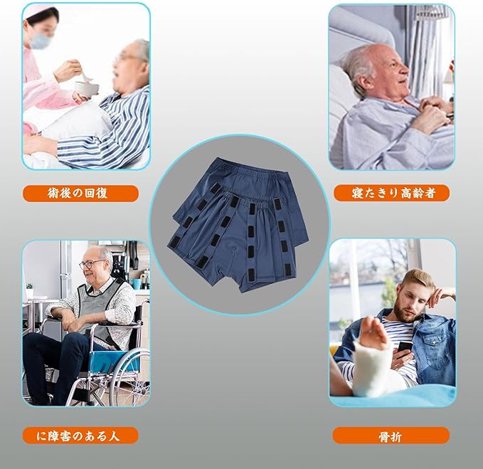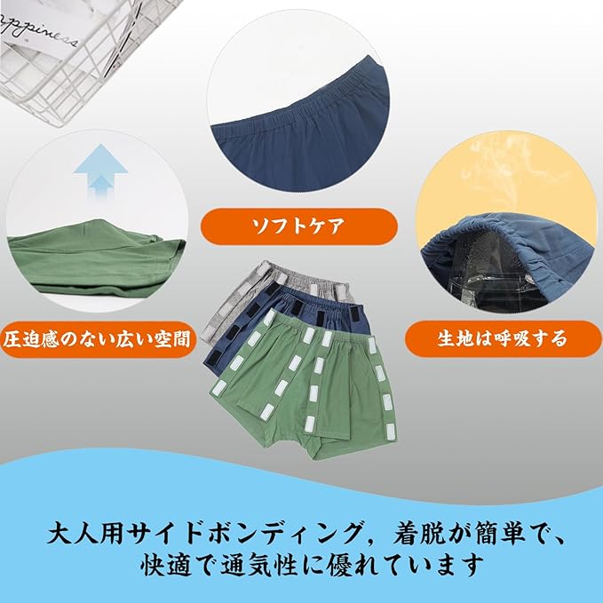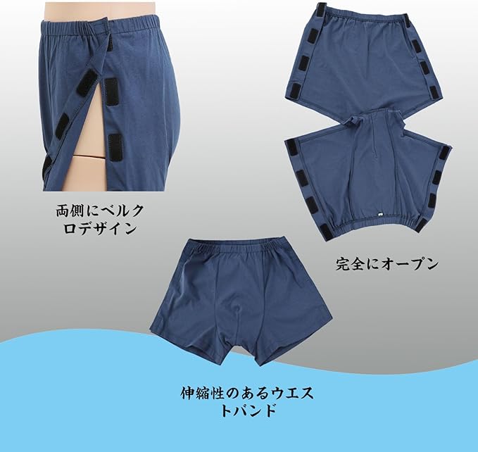 【介護に負担を軽減】マジックテープ仕様、寝たり座ったりの状態でも着脱が簡単。おむつ交換時にはだけてしまわないよう、ウエスト部分にはゴム止め付。