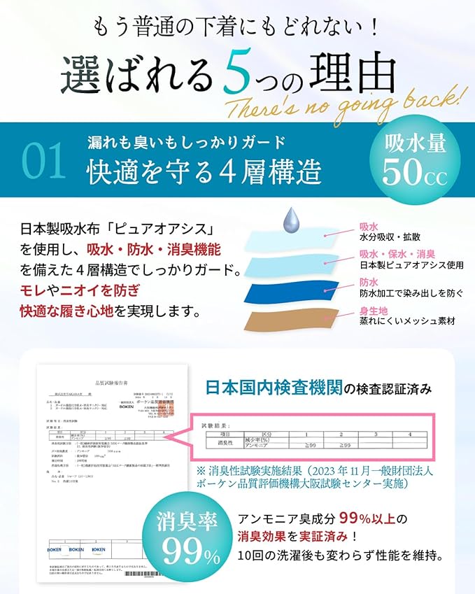 【モレもニオイも安心の4層構造】 日本製吸水布「ピュアオアシス」を使用し、吸水・防水・消臭機能を備えた4層構造でしっかりガード。モレやニオイを防ぎ、快適な履き心地を実現します。
