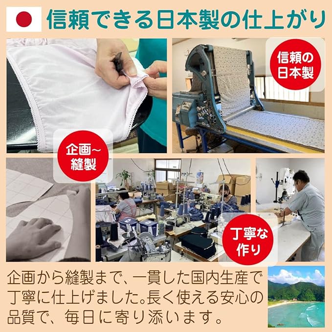 【安心と信頼の日本製】 全工程を国内で行い、細部まで品質にこだわった純日本製。洗濯しても型崩れしにくく、長くご使用いただける耐久性を備えています。