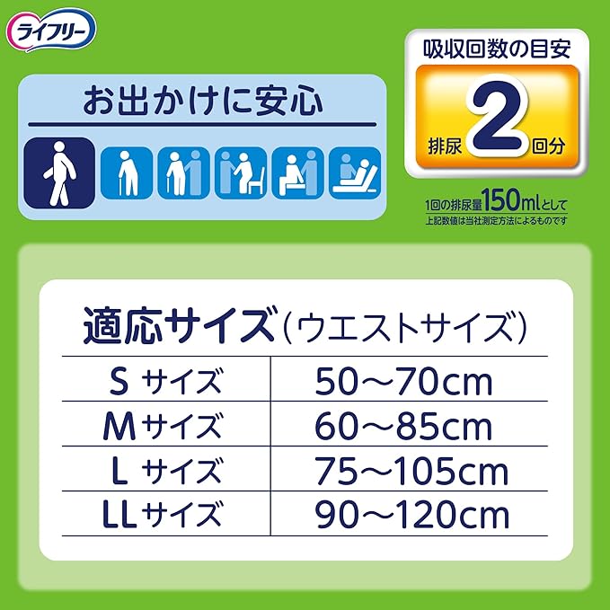 初めての方にも手軽にご使用いただける、まるで下着のような紙パンツです。●超うす吸収体なので、下着のようにすっきりフィット。●お肌にやさしいやわらかな素材が、下着のようにここちよい肌触り。●全面通気シートで、ムレずにサラサラ。●ニオイを閉じ込める、消臭ポリマー※配合。※アンモニアについての消臭効果があります。おしっこ約2回分(約300cc)を吸収します。