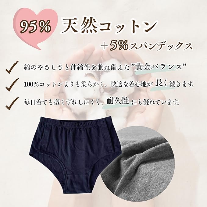 ✅【目立たない吸収帯で安心!】見た目は普通のパンツのようにスッキリ!表から吸収帯が目立たず、自然に着用できます。さらに、縫い目には「にじみ防止加工」を施し、しっかりガード。安心してお使いいただけます。