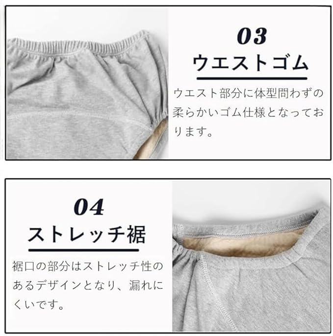 【目立ちにくい吸収帯】伸縮性がよく、腰回りに締め付け感がなくぴったりと合わせ、安定感を与えます。裾も圧迫感のない柔らかい弾力糸を使っています、お足をゆったりと包み、お尻にも全方位に包み込みますので、ずり上がり、ズレなどの心配はありません。見た目は普通パンツに見えますが、表側からは吸水帯が目立ちません。さらに吸水帯の縫い合には「滲み出し防止」の工夫をしています。
