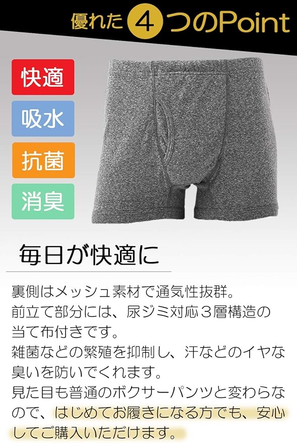 【こんなお悩みありませんか?】トイレの後、尿がズボンにしみないか不安(尿ジミ)…そんな「おっかけ漏れ」「ちょい漏れ」防止のお悩み解決ボクサーパンツ。履きごこちが柔らかく、肌ざわりが滑らかな、お洗濯しても型崩れしにくい下着です。※軽失禁機能はありません。【毎日快適に】前当て部分には、尿シミ対応の吸水性がある「3層構造当て布」が付いています。前当て裏側はメッシュ素材で通気性抜群。「抗菌」「消臭」加工も施されており、雑菌の繁殖を抑制し汗などの臭いも防いでくれます。いつも清潔・快適、ゆったりウエスト仕様。【見た目普通のボクサーパンツ】異性に知られたくない・バレたくない!!!そんな方におすすめです。見た目は普通のボクサーパンツと何も変わらないので、はじめてお履きになる方でも、安心してご購入いただけます。ロゴのないシンプルなデザインで、年代を問わずご愛用いただけます。レギュラー丈を採用しており、タイツ・ズボン下・ももひきの中にもフィットし、太ももまわりもスッキリ。綿素材なのでオールシーズンご使用いただけます。普段使いはもちろん、スポーツやアウトドアなどいろいろなシーンにおすすめです。