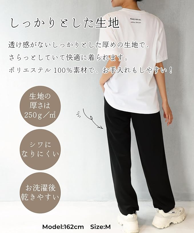 【しっかりとした生地】透け感がないしっかりとした厚めの生地(生地の厚さ250g/㎡)で、さらっとしていて快適に着られます。ポリエステル100%素材で、お手入れもしやすい!お洗濯後乾きやすく、シワになりにくいです。