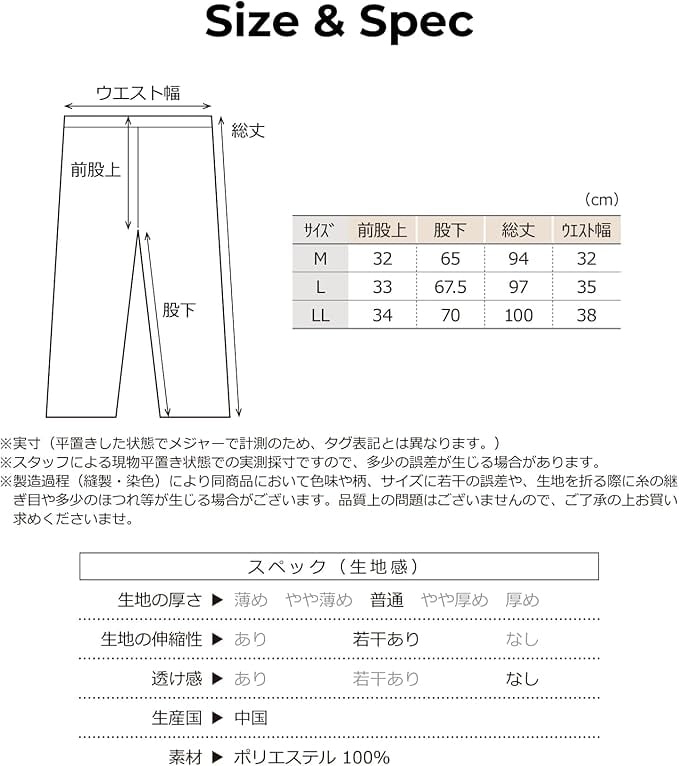 【Mサイズ】前股上32 股下65 総丈64 ウエスト幅32 cm 【Lサイズ】前股上33 股下67.5 総丈97 ウエスト幅35 cm 【LLサイズ】前股上34 股下70 総丈100 ウエスト幅38 cm