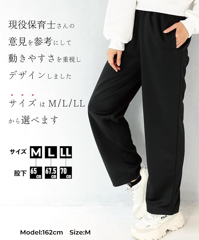 【保育士さんの声を参考に作りました!】現役保育士さんの意見を参考にして、動きやすさを重視しデザインしました。サイドラインがないシンプルデザインで、どんなトップスとも合わせやすいです。サイズはM/L/LLから選べます。