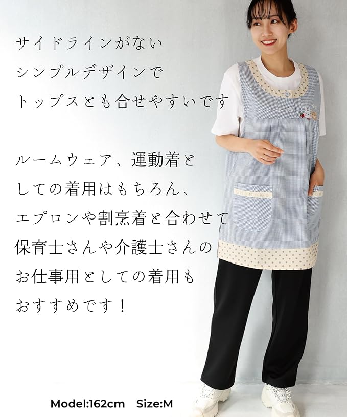 【お仕事用にもオススメ】ルームウェア、運動着としての着用はもちろん、エプロンや割烹着と合わせて保育士さんや介護士さんのお仕事用の着用もおすすめです。