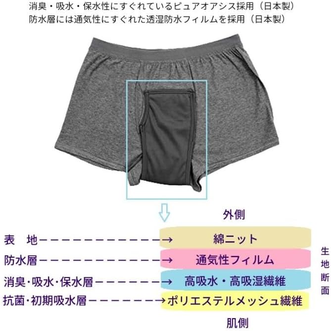 伸縮性に優れたストレッチ素材で、運動の際にもぴったりの尿漏れパンツ。 見た目が通常のボクサーパンツと変わらない為、人前で着替える時でも心配ありません。 水分は通さず、空気と湿気だけを通す為、漏れを防ぎながらムレも防ぎます。①ピュアオアシス採用 ポリアクリル酸ナトリウム塩が主成分のポリマーを直接紡糸し、 繊維の形状にした吸水性・消臭性に優れたピュアオアシスを採用。 従来の製品よりも、さらにしっかり給水・消臭します。 ➁通気性フィルム使用 水は通さず、空気・湿気だけを通すので、モレを防ぎながらもムレません。 ③さわやかフィット/綿ストレッチベア天竺使用 身体にフィットしストレッチ性ばつぐん 【素材】 綿95% ポリウレタン5% ご使用上の注意) ・ドライクリーニング、乾燥機の使用は避けてください。 手洗いまたは洗濯機使用の場合はネットに入れてください。