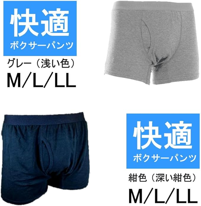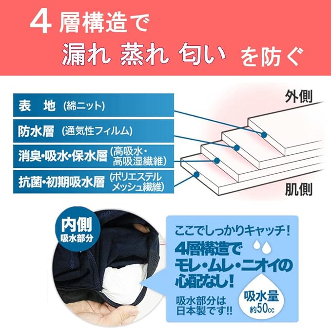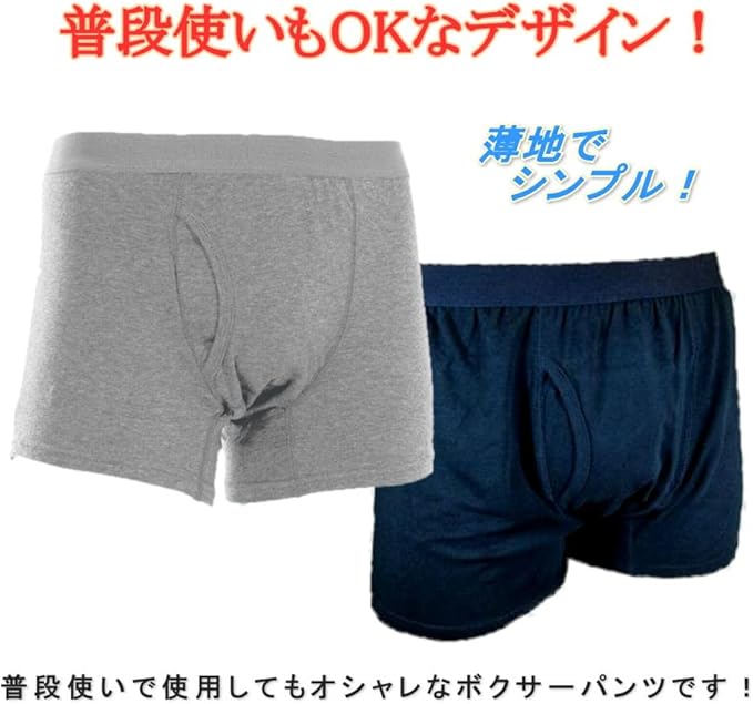 普段使いで使用してもおしゃれなデザインで、薄地でシンプルなボクサーパンツです。 4層構造で漏れ・蒸れ・匂いを防ぎます。軽失禁で給水量約50㏄。 銭湯などへ行ってパンツを脱いでも、裏地が同系色の生地で目立ちません。