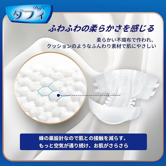 【ふわふわさを感じる】ダフィの大人用おむつ テープ式 は柔らかい不織布で作われ、クッションのようなふんわり素材で肌にやさしい、ここちよい肌触りです。