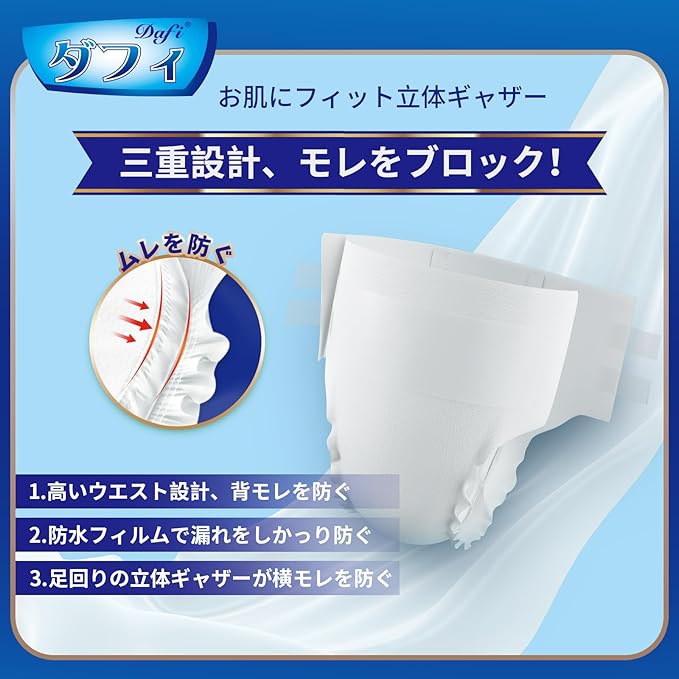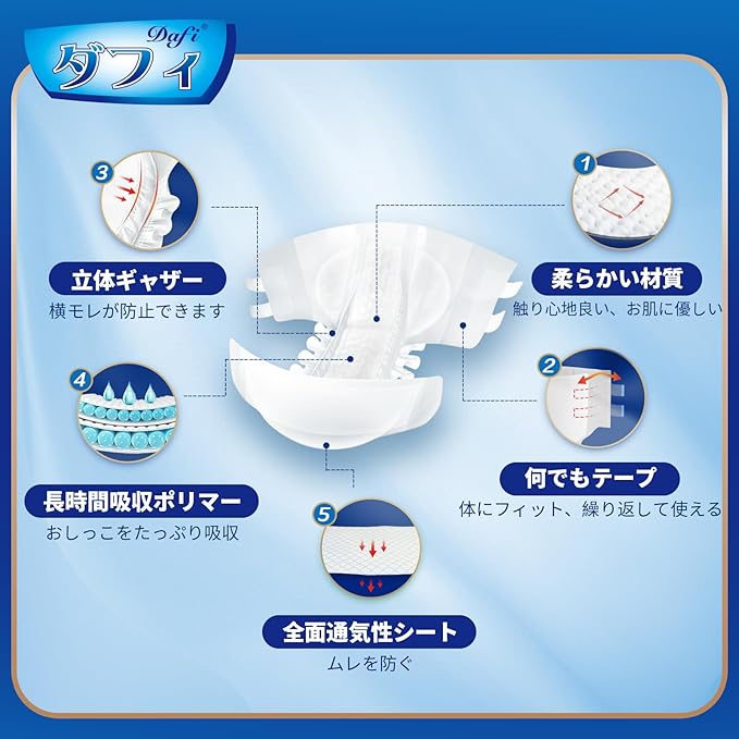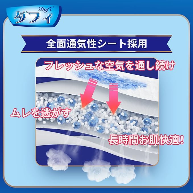 【通気設計】ダフィ大人用おむつは全面通気性シートを採用します。フレッシュな空気を通し続け、気になるニオイと湿気だけ追い出します、抗菌消臭成分配合でムレを防いでお肌快適。
