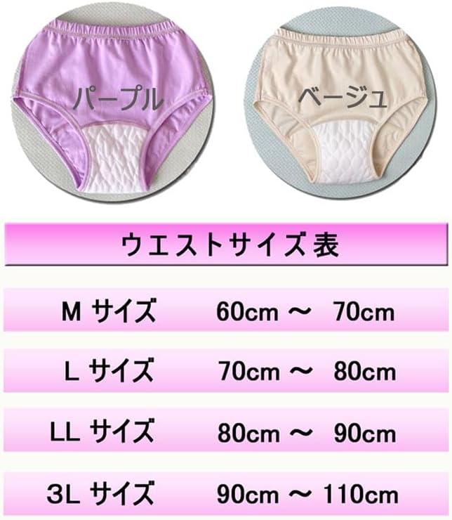 【ウエストサイズ カラー】ウエストのサイズ4サイズ Mサイズ 60CM~70㎝ Lサイズ 70㎝~80㎝ LLサイズ 80㎝~90㎝ 3Lサイズ 90㎝~110㎝ カラー2種類 ベージュ パープル