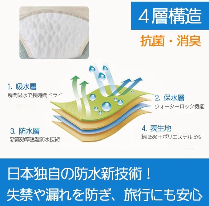 【しっかりの4層構造】❶吸水層 瞬間吸水で長時間ドライ❷保水層 ウォーターロック機能❸防水層 新高効率透湿防水技術❹表生地 綿95パーセント+ポリエステル5%