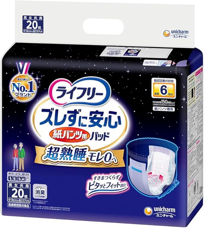 夜用の尿とりパッドは、就寝前に下着に貼り付けて使用します。1回の使用後または6時間ごとに交換してください。使用後は、包み紙で包んでからごみ箱に捨ててください。