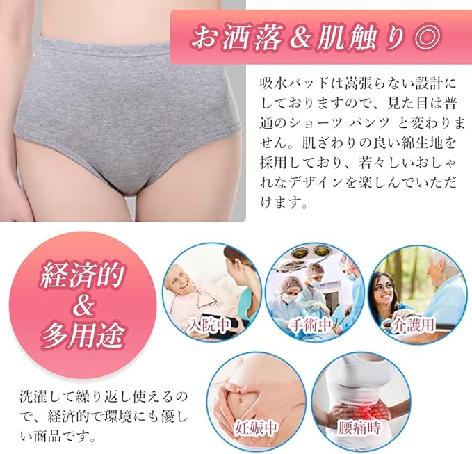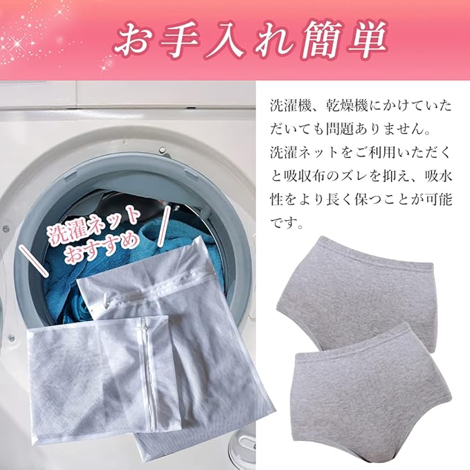 【お手入れ簡単】洗濯機、乾燥機にかけていただいても問題ありません。洗濯ネットをご利用いただくと吸収布のズレを抑え、吸水性をより長く保つことが可能です。【繰り返し使えるので経済的】見た目や履き心地が普通のショーツと変わらず、洗濯して繰り返し使えるので、経済的で環境にも優しい商品です。