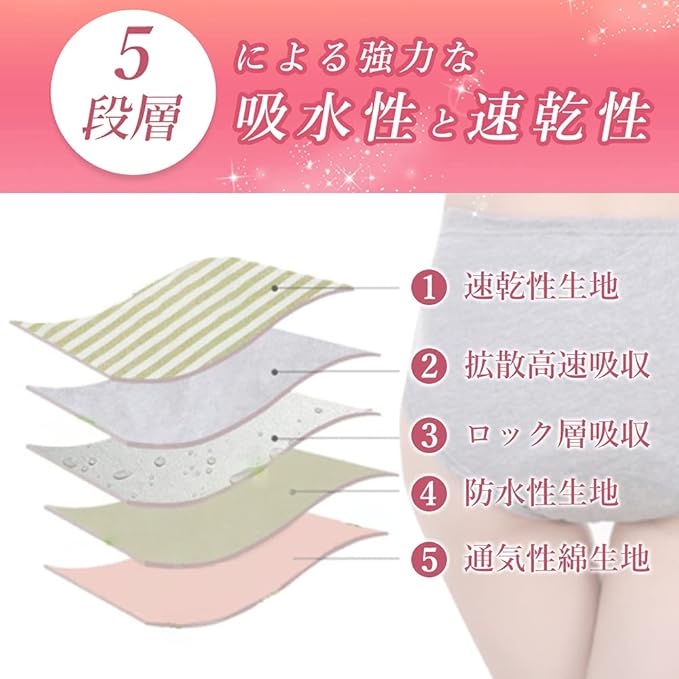 【5段層による強力な吸水性と速乾性】失禁パンツの吸水箇所は5段層で、漏れにくい設計にしています。吸水シートに加え、一番外側には速乾性のある生地を採用しているので、漏れた箇所もすぐに乾きます。