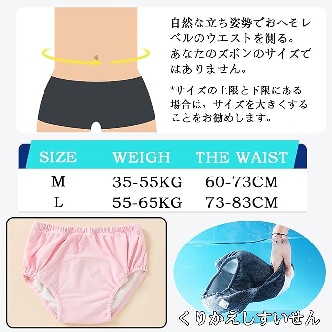 【失禁パンツ 女性用サイズ】M:ウエスト60-73cm おススメ体重範囲:35-55kg;L:ウエスト73-83cm おススメ体重範囲:55-65kg;サイズの締め付け感なく、股間部分だけがにょうもれパンツ女性用特別の素材で、普通のパンツで履きやすい感じです。