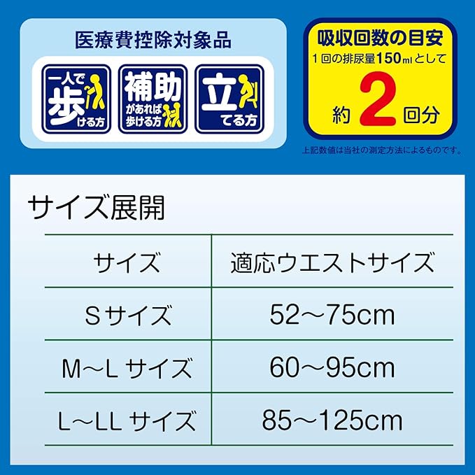 この成人用下着は、個人での歩行が可能な方向けです。使用方法は、下着を正しい方向に着用し、必要に応じて交換し、使用後は衛生的に廃棄してください。適切なサイズを選ぶために、ウエストの測定をしてください。ウエストは85~125cmに対応しています。
