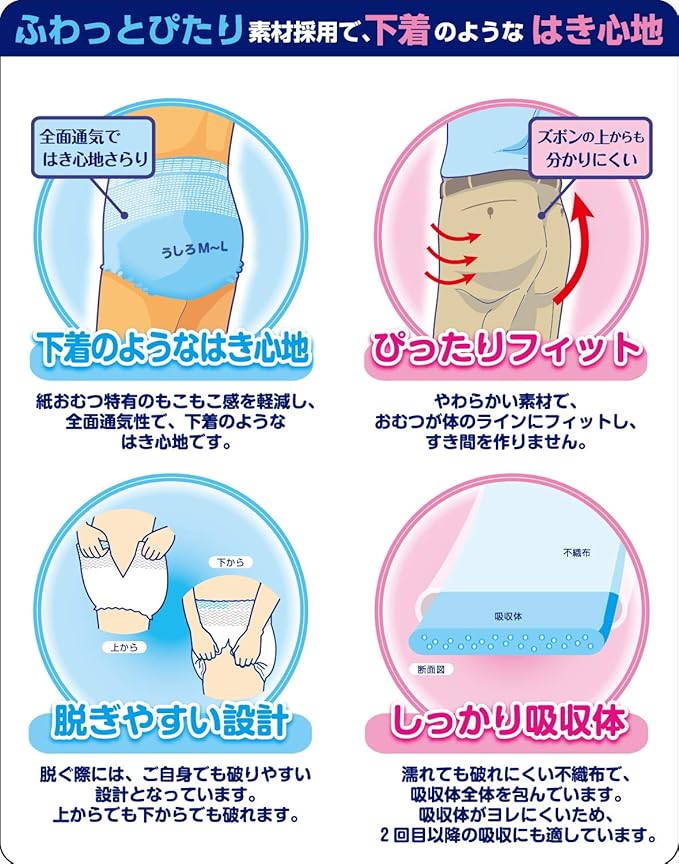 この成人用下着は、個人での歩行が可能な方向けです。使用方法は、下着を正しい方向に着用し、必要に応じて交換し、使用後は衛生的に廃棄してください。適切なサイズを選ぶために、ウエストの測定をしてください。ウエストは85~125cmに対応しています。 続きを見る