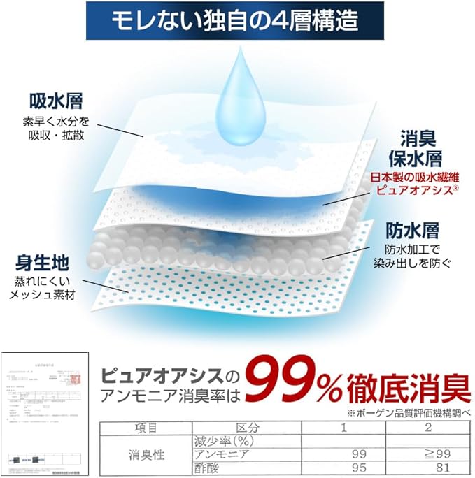 吸水吸湿繊維の日本製「ピュアオアシス」を使用した4層構造の吸水パッドが最大約100ccまで吸水し、ムレを軽減します。 ※吸水量試験機関ユニチカガーメンテック(株) 生地にはメッシュ素材を使用しているため通気性に優れ、蒸れにくく、夏でも爽やかな着用感が続きます。 サイドパッド付きで横モレまでカバーし、漏れ出る心配もありません。 フロント部には防水布を採用し、ズボン表面へのシミ出しを防止します。 さらに、アンモニア消臭性能にも優れ、ニオイを抑えます。 洗濯後もアンモニアの消臭率の落ちない高性能素材です。 パットは薄型設計でアウターの上から目立ちにくく、普通のパンツを履いているのと変わらない見た目です。
