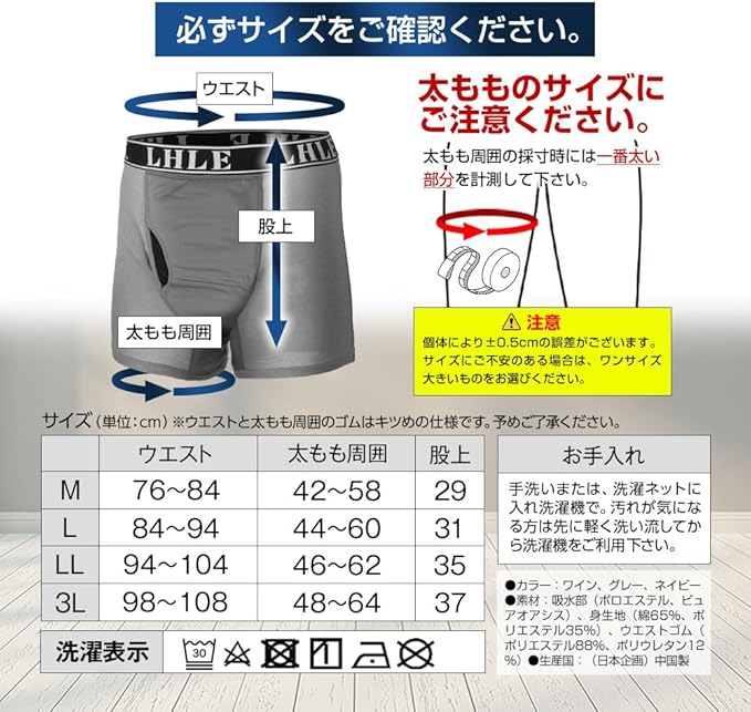 ●適応サイズ約(寸法:cm) M/ウエスト76~84、股上29、太もも周囲30~42、ヒップ80 L/ウエスト84~94、股上31、太もも周囲34~48、ヒップ88 LL/ウエスト94~104、股上33、太もも周囲36~50、ヒップ96 3L/ウエスト98~108、股上35、太もも周囲46~61、ヒップ108 ●カラー:ワイン、グレー、ネイビー ●素材:吸水部(ポロエステル、ピュアオアシス)、身生地(綿65%、ポリエステル35%)、ウエストゴム(ポリエステル88%、ポリウレタン12%) ●生産国:(日本企画)中国製