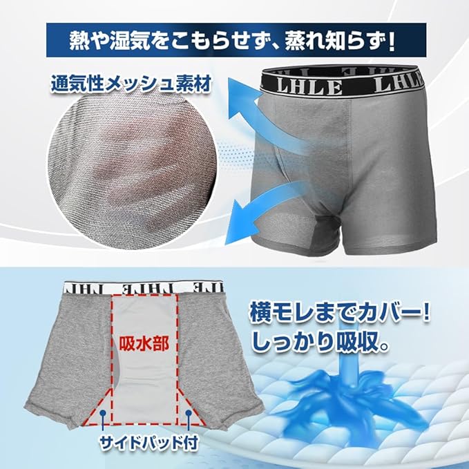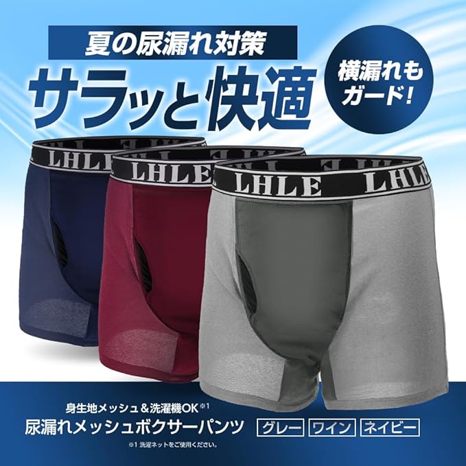 「尿漏れメッシュボクサーパンツ3色組」は、日本製の吸水素材「ピュアオアシス」を使用した、男性向け尿漏れパンツです。 最大約100㏄まで吸水可能な吸水パッドで、軽失禁の方におすすめです。 ゴワゴワ感のない快適な履き心地です。 洗濯してくり返し使えます。(手洗いまたは、洗濯機ご使用の場合は洗濯ネットに入れてください。) 尿漏れパンツのムレが気になる方、機能性と履き心地を重視したい方、ムレやすく臭いを抑えたい方に特におすすめです。 夏の尿漏れ対策に「尿漏れメッシュボクサーパンツ3色組」で毎日を快適にお過ごしください。