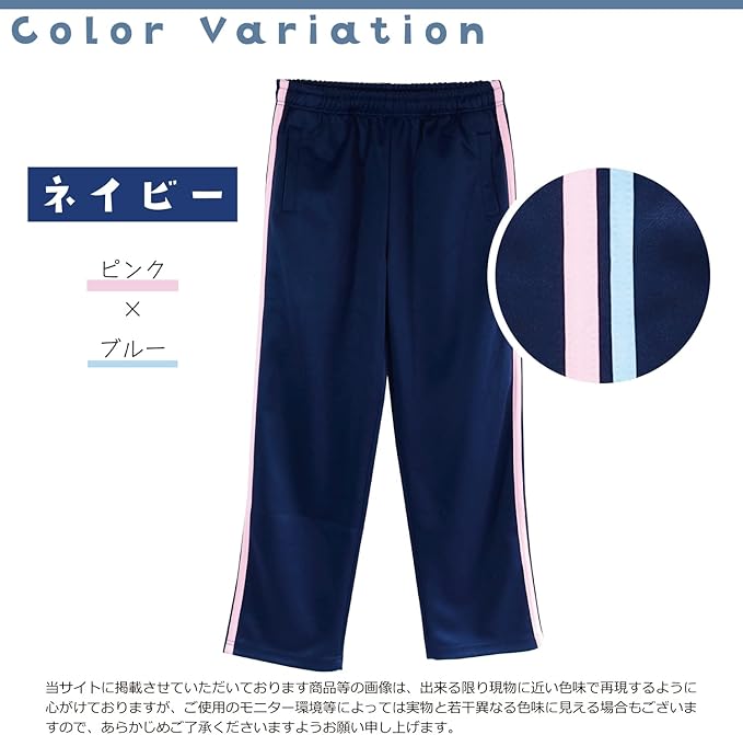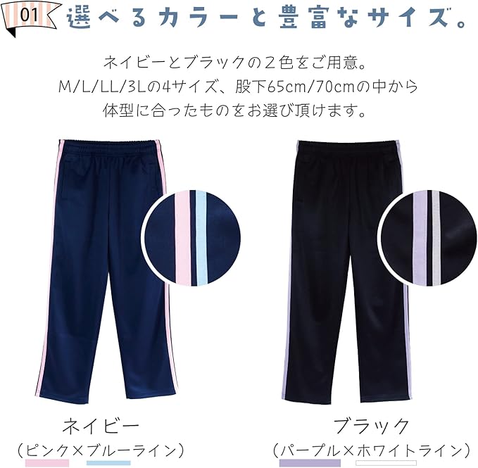 【選べるカラーと豊富なサイズ】ネイビーとブラックの2色をご用意。M/L/LL/3Lの4サイズ、股下65cm/70cmの中から、体型に合ったものをお選びいただけます。ネイビーにはピンク ブルーのライン、ブラックにはパープル ホワイトのラインがサイドに入っています。