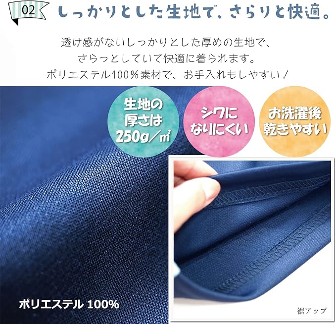 【しっかりとした生地感で、さらりと快適】透け感がない、しっかりとした厚めの生地(250g/㎡)で、さらっとしていて快適に着られます。ポリエステル100%素材でシワになりにくく、お洗濯後も乾きやすいので、お手入れもしやすいです。