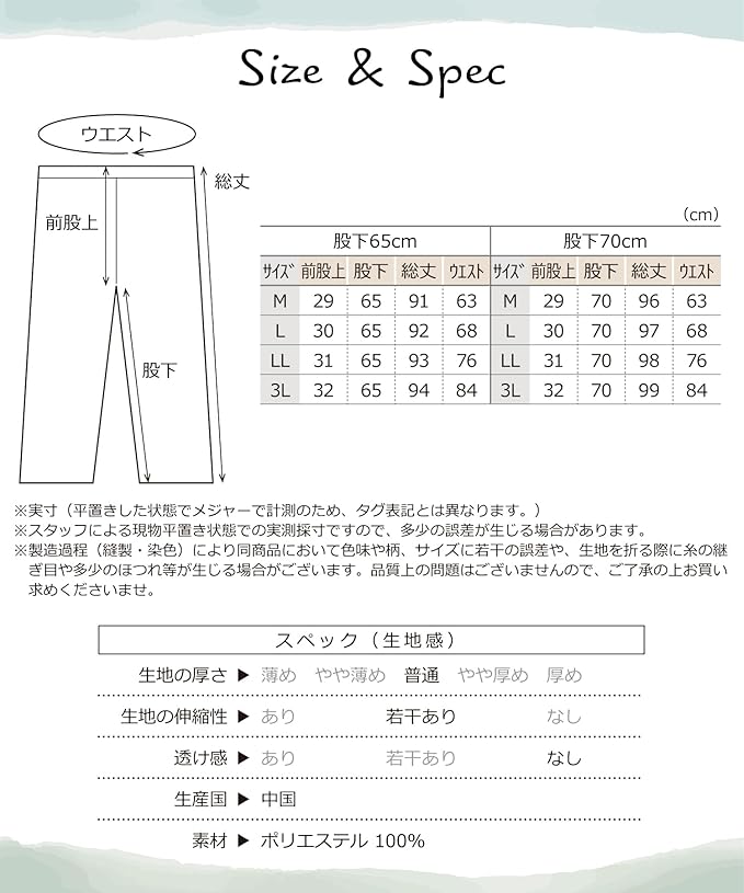 【股下65cm】〈Mサイズ〉前股上29 股下65 総丈91 ウエスト63 cm 〈Lサイズ〉前股上30 股下65 総丈92 ウエスト68 cm 〈LLサイズ〉前股上31 股下65 総丈93 ウエスト76 cm 〈3Lサイズ〉前股上32 股下65 総丈94 ウエスト84 cm