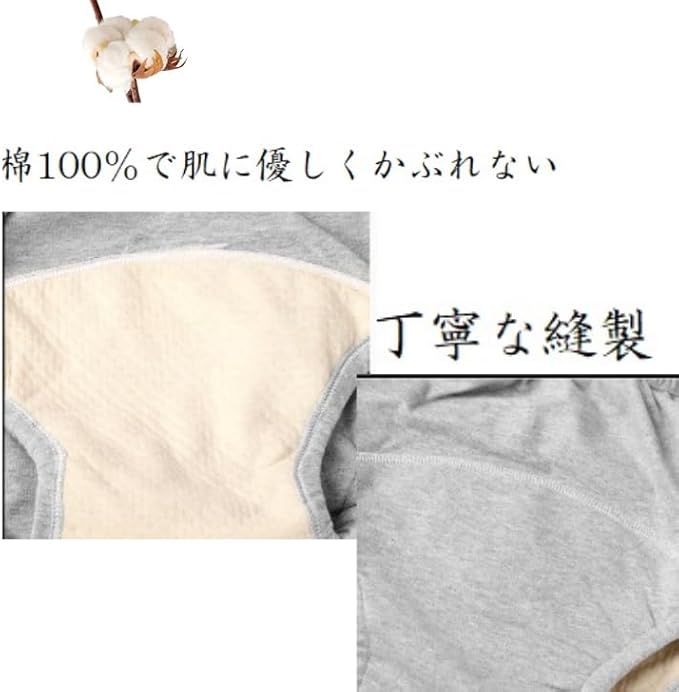婦人用軽失禁ショーツ2枚セット(グレーピンク)は、目立ちにくい大きめ吸収帯としっかりした5層構造で安心の履き心地を提供します。外側は肌触りの良い綿100%、TPU防水フィルム内蔵、竹繊維消臭機能付き吸水布、吸水性抜群のパイル素材、そして直接肌に触れる部分には柔らかい生地を使用しています。見た目は普通のショーツと変わらず、失禁パンツとわからない自然な厚みです。