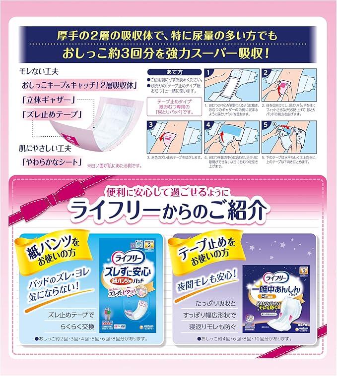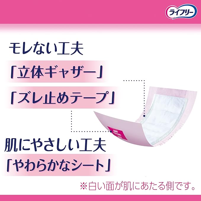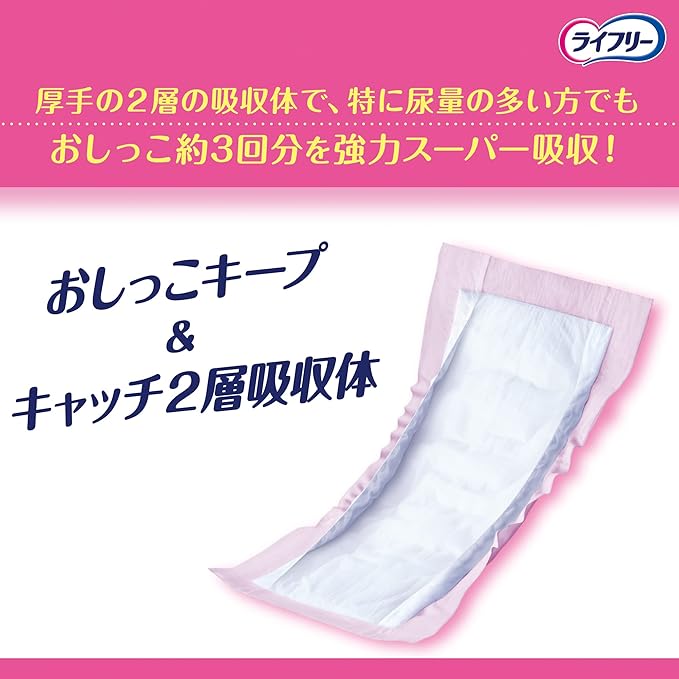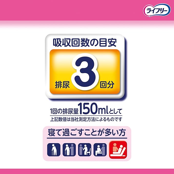 この尿とりパッドは、おしっこ約3回分をスーパー吸収できます。立体ギャザーがすき間をつくらず、モレを防ぎます。使用後は、適切な方法で廃棄してください。