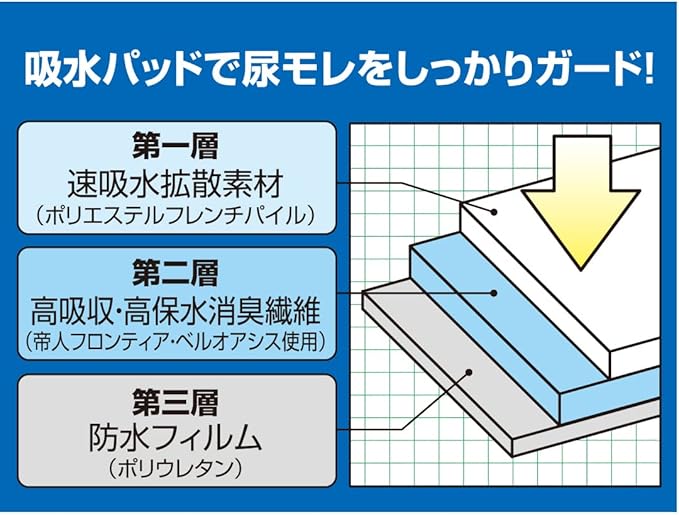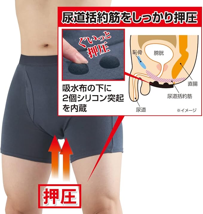 尿モレしにくい下半身に! 尿道括約筋を押圧サポートする失禁パンツ。 加齢により尿道括約筋など膀胱を支える筋肉の衰えが尿モレを引き起こすことがあります。 この失禁パンツは尿モレをしっかり吸水するパッドを前面からお尻まで配置。 底部には2つの突起を内蔵して衰えた尿道括約筋をしっかり押圧サポートします。