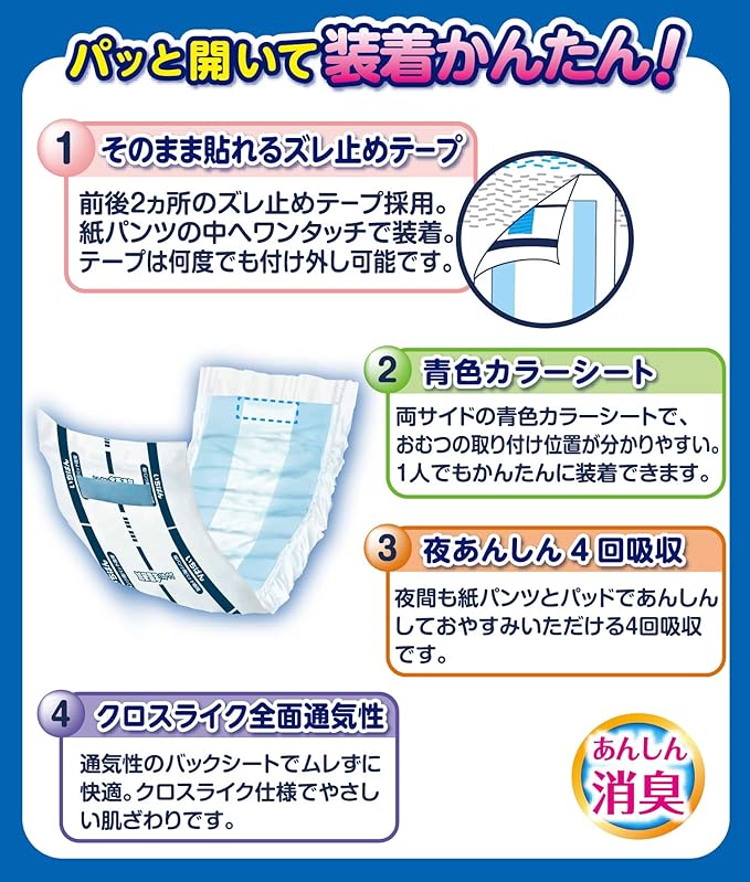 両サイドのカラーシートでおむつの取り付け位置が分かりやすく、1人でもかんたんに装着できます。
