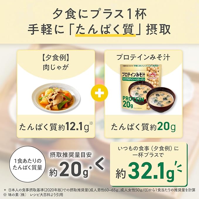 1食でたんぱく質20gを摂れる、温かく甘くないみそ汁味のプロテインです。