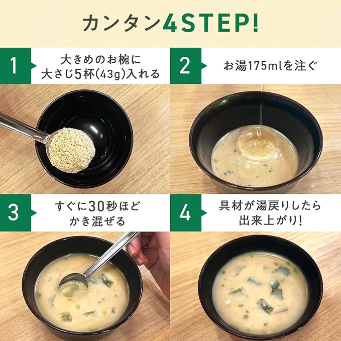①よくかき混ぜてから大さじ5杯をすくい、大きめのお椀にいれます。 ②沸騰させたお湯175mLを注ぎ、すぐに30秒ほどかき混ぜてください。 続きを見る