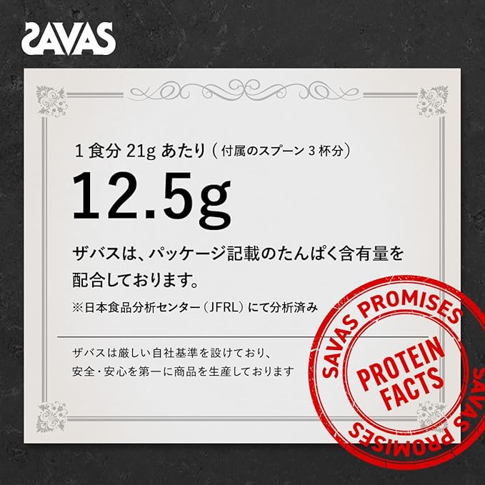 【原材料名】乳清たんぱく(アメリカ製造、ニュージーランド製造)、ココアパウダー、難消化性デキストリン、植物油脂、食塩/炭酸Ca、乳化剤、炭酸Mg、甘味料(アスパルテーム・L-フェニルアラニン化合物、スクラロース)、増粘剤(プルラン)、V.C、香料、ピロリン酸第二鉄、V.E、V.B2、V.B6、パントテン酸Ca、V.B1、ナイアシン、V.A、V.D、V.B12、(一部に乳成分・大豆を含む)【栄養成分表示 1食分(21g)当たり】エネルギー:73kcal、 たんぱく質:12.5g、 脂質:1.4g、 炭水化物:3.6g、食塩相当量:0.21~0.50g、 カルシウム:280mg、鉄:0.80~5.10mg、マグネシウム:50mg、ナイアシン:2.6~10.0mg、 パントテン酸:0.34~1.16mg、ビタミンA:110~340μg、ビタミンB1:0.50mg、 ビタミンB2:0.57mg、 ビタミンB6:0.42mg、 ビタミンB12:0.45~3.11μg、 ビタミンC:32mg、 ビタミンD:9.1 g、ビタミンE:1.02mg