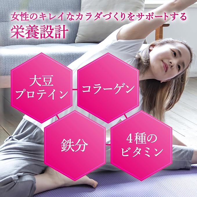 大豆たんぱく質(国内製造)、魚コラーゲンペプチド(ゼラチンを含む)/酸味料、安定剤(セルロース、カラギナン)、ビタミンC、甘味料(アセスルファムK、スクラロース)、香料、ピロリン酸鉄、ビタミンE、ビタミンB₆、葉酸(乳由来)、ビタミンD、ビタミンB12