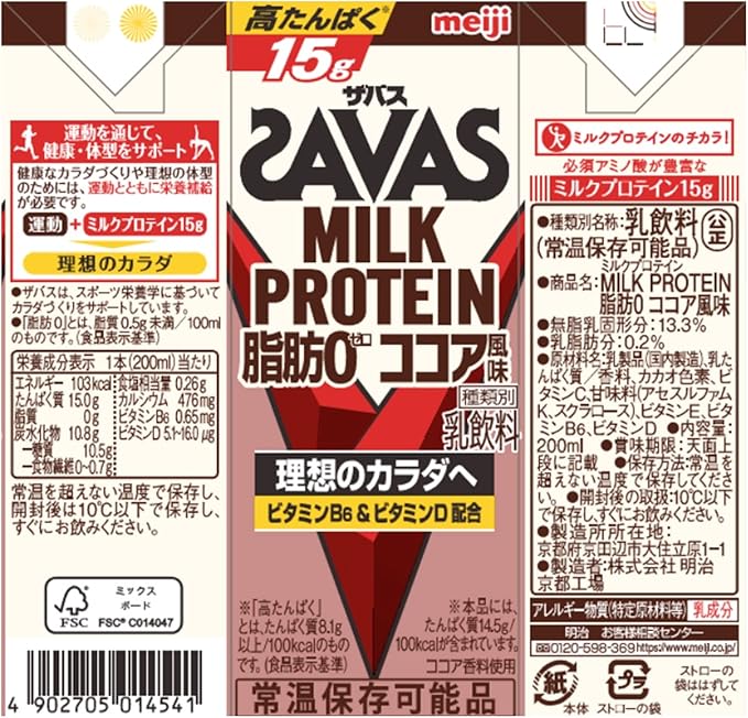 カラダづくりに有効なミルクプロテインを粉末タイプのザバス1食分と同じ15g配合し、独自の速攻吸収製法で吸収速度を高めました。運動後はもちろん、忙しい朝やランチのお供に手軽に飲んでいただけます。常温で保管もできる「(ザバス)MILK PROTEIN(ミルクプロテイン)脂肪0 」で手軽に毎日たんぱく質をとってみませんか。商品につきまして問題がございましたら、お手数ですが下記までご連絡いただきますようお願いいたします。「株式会社 明治 お客様相談センター」 フリーダイヤル: 0120-858-660受付時間:9:00~17:00(土日祝日、年末年始除く)