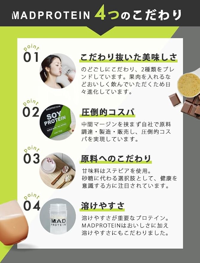 [コスパ]続けて飲む為に重要なコスパ。MADPROTEINは中間マージンを挟まず自社で原料調達、製造、販売し圧倒的なコスパを実現しています。