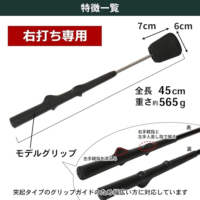 ・正しいグリップが覚えられるモデルグリップを装着した素振り用練習器具