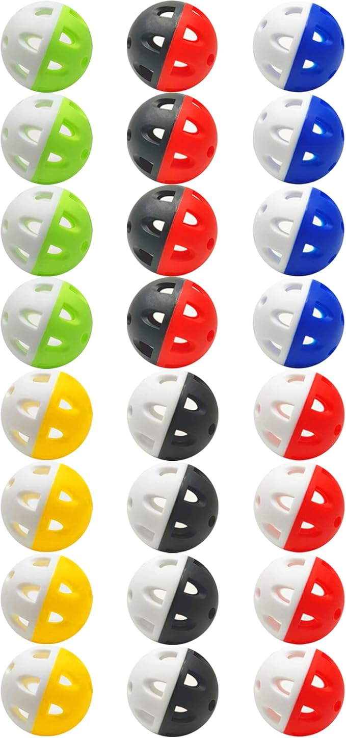 【デザイン】24穴中空デザイン。 【ゴルフ球用品パッケージ内容】 練習用ボール 24個入 【カラー】 黄と白、緑と白、黒と白、青と白、赤と白、赤と黒 【製品特徴】 ◆ 軽く壊れにくい素材を採用!使いやすい程良い弾力性があるボール。 ◆ 見えやすいカラー 夜間でも天候が悪くても視認性が良い。 ◆ 柔らかいボールかく安全なので、どんな動物や人々を傷つけることはありません。 ◆ 室内、野外でご使用いただけますのでゴルフのスイング練習で使用可能です。 【高品質練習ボール】 アプローチ練習に最適なゴルフ練習用ボールです。ショット後の軌道が見えやすいのはもちろん練習後のボール拾いの際にも見つけやすくなっています。 屋内または屋外の使用に適していて、すべての年齢のゴルファーに絶好で、両方の初心者と技術レベル。 【軽量で頑丈なトレーニングボール】穴が開いたボールは飛距離が出過ぎないため、飛び過ぎによる紛失を防ぎます。中空デザインにより、各ボールはどこにでも持ち運べるほど軽量になり、耐久性のあるEVAから作られています、 彼らは従来のプラスチック製のトレーニングゴルフ練習ボールよりも耐久性があります。 【多用途ボール】ゴルフボール、練習野球でも、Wiffleボールでも、ペットと一緒に遊んでも、ノンストップで楽しめる中空のデザインのおかげで、小さな子供も大人もこの耐久性の高いゴルフ練習ボールを愛するでしょう。軟式ゴルフ球にご満足いただけない場合やご不明な点がございましたら、お気軽にお問い合わせください。12時間以内に最適なソリューションを提供いたします。