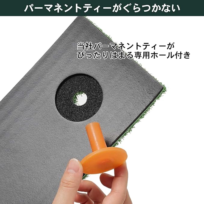 【衝撃吸収マット&ゴムティー専用ホール】底面に貼られた厚さ7㎜のラバースポンジが、ショット時の衝撃を和らげます。当社ゴムティーに対応した専用ホール付きで、当社ゴムティーがぴったりセットできるから、ドライバーショットの練習も可能です。