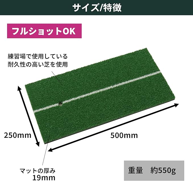 【マットサイズ】250㎜ 500㎜【マット重量】約550g、フルショット練習にもアプローチ練習にも最適な少し大きめなマット。