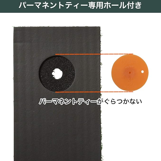 【衝撃吸収マット&ゴムティー専用ホール】底面に貼られた厚さ7㎜のラバースポンジが、ショット時の衝撃を和らげます。当社ゴムティーに対応した専用ホール付きで、当社ゴムティーがぴったりセットできるから、ドライバーショットの練習も可能です。