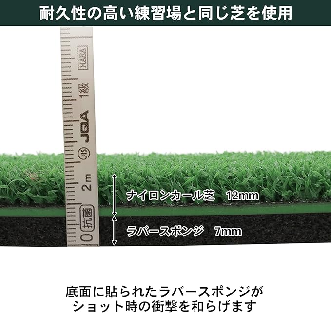 【練習場と同じ高耐久芝】練習場と同じナイロン製のカール芝を使用したゴルフ練習用マット。高耐久で芝が剝げにくいのが特徴です。いつでもどこでも練習場と同じ感覚でショット練習をすることができます。