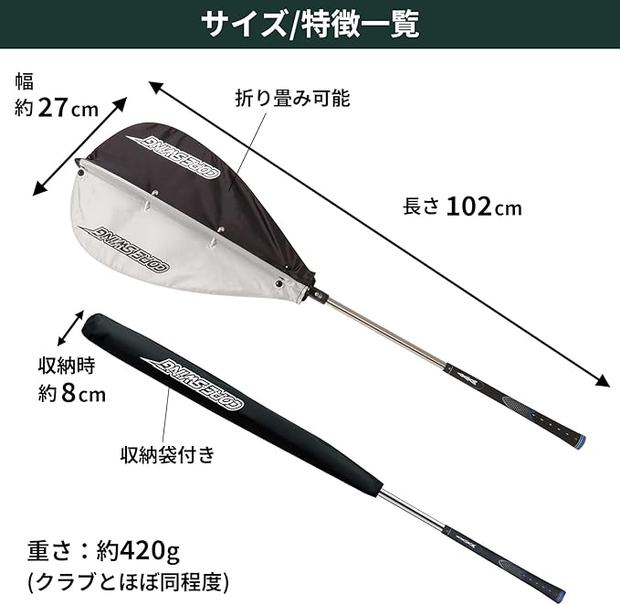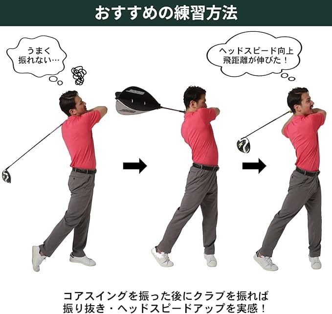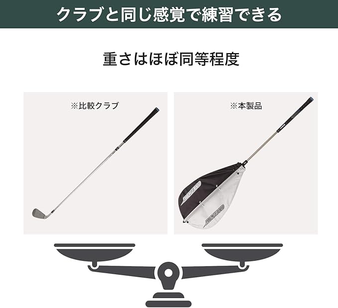 【空気抵抗を感じながら安定したスイング軸を鍛える素振り用練習器具】 初心者や女性の方でも振れる、ほどよい抵抗感、スイング軸の安定とスクエアなインパクトが自然に身に付くことによって、ミート率、つかまり、ヘッドスピードUP等が期待でき、それらが総合的に作用して飛距離アップへと導きます