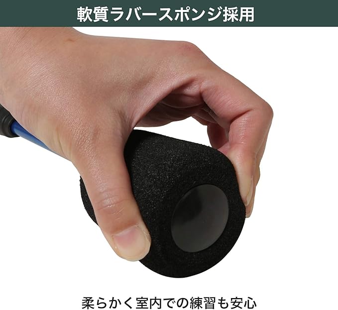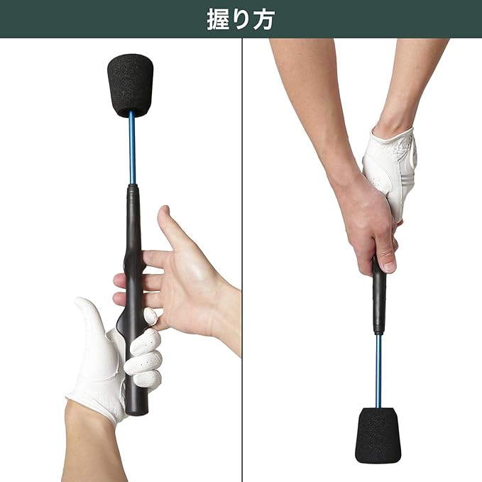 正しいグリップが覚えられるモデルグリップを装着した素振り用練習器具。