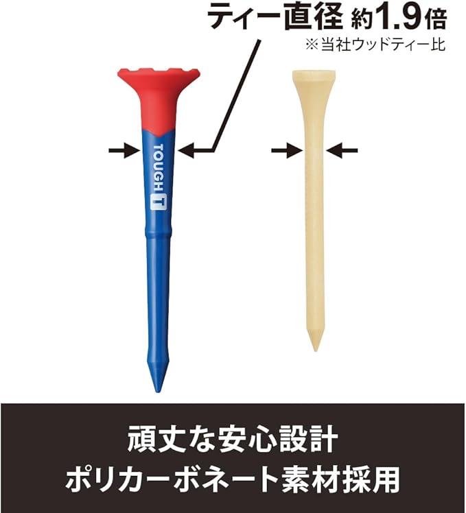 【とにかく丈夫で折れにくい】丈夫なポリカーボネート素材を採用し、さらにティー直径を約1.9倍*と太めに頑丈に設計することで、折れにくいティーに仕上げました。ティーが折れにくいのでラウンド中もストレスなく、安定したプレーを期待できます。【ティーの全長80mm/ティーアップガイド使用時40mm】*当社ウッドティー比較