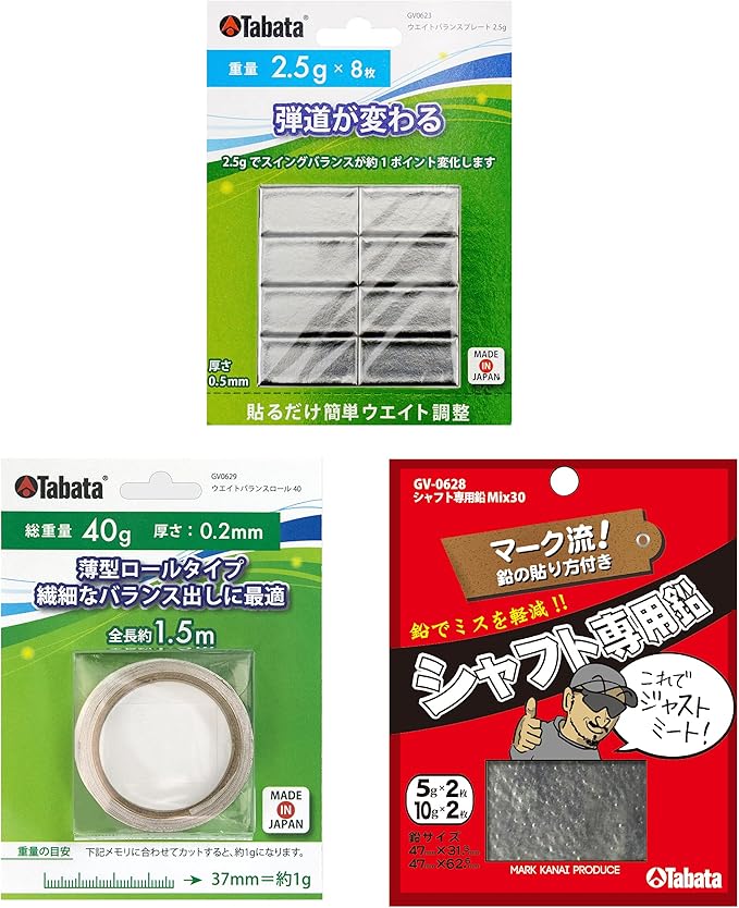 ウエイトロール、バランスプレート、特殊製法を採用した鉛で、シャフトやクラブヘッドなどにフィットしやすい鉛。