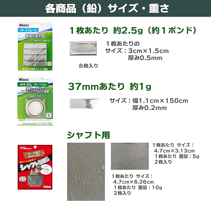 シャフト専用鉛:特殊製法採用の鉛で、シャフトなどにフィットしやすく貼りやすい。マーク流おすすめクラブ重量目安や貼り方イラスト説明付。